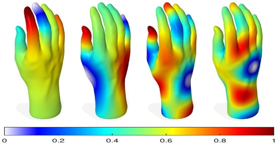Visualization of four eigenvectors of the normalized mesh Laplacian matrix. From left to right: a 3D hand model Gouraud shaded and color-coded by the values of the second, eighth, fifteenth and twentieth eigenvectors.