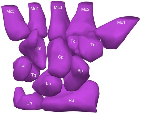 In this section, through extensive experiments, we evaluate the performance of our proposed mesh denoising approach on carpal bone surfaces []. As shown in Figure 4, the carpal bones of the right wrist in a healthy male are the capitate, hamate, lunate, pisiform, scaphoid, trapezium, trapezoid, and triquetrum. Since the trapeziometacarpal joint of the thumb is a common site for osteoarthritis, the first metacarpal bone is also considered in our analysis. The forearm’s radius and ulna bones, which support the many muscles that manipulate the bones of the hand and wrist, are also depicted in Figure 4.