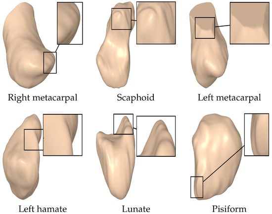 We performed extensive experiments on various carpal bone surfaces, including the right metacarpal, scaphoid, left metacarpal, left hamate, lunate, and pisiform, as shown in Figure 5.