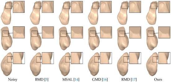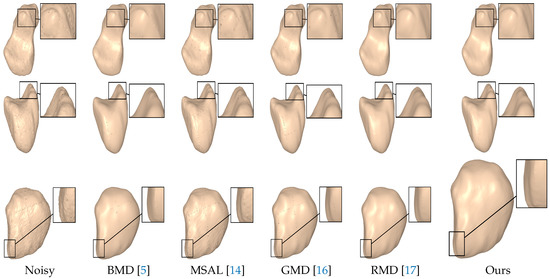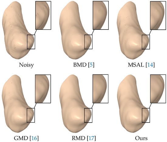 The visual comparison was performed with the most prevalent methods of 3D mesh denoising, including BMD [], MSAL [], GMD [] and RMD []. As shown in Figure 6, the noisy right metacarpal model was generated by adding a Gaussian noise with a standard deviation of to the vertices of the ground truth mesh along the vertex normals. As can be seen, the output results of BMD, MSAL, GMD and RMD still contained a considerable amount of noise in some regions of the denoised model, while the proposed approach removed the noise well and, at the same time, preserved the surface detail. Figure 7 displays the denoising results on the noisy scaphoid, left metacarpal, and left hamate models with a noise standard deviation of , proportional to the mean edge length of the mesh. Notice again that the proposed approach preserved the edges well, while RMD tended to over-smooth the features. Further, the noise was mostly eliminated using our approach without affecting flat regions. Further, the sharp features were well preserved, as depicted in the enlarged views, which shows that the geometric structures and the fine details of the denoised carpal bone models were very well preserved.