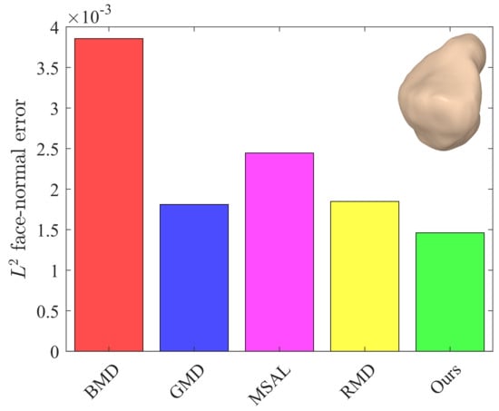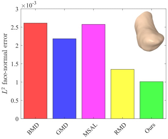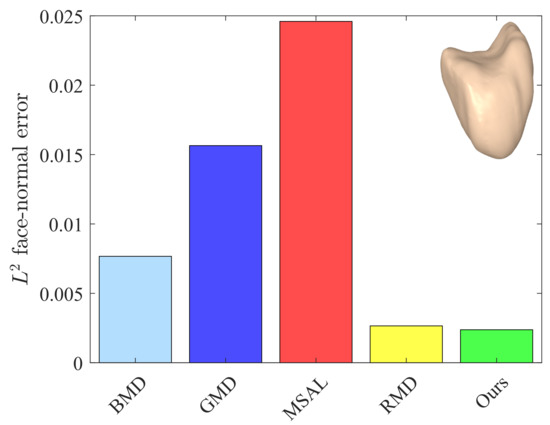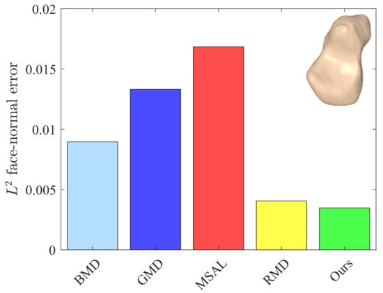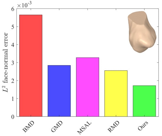 The values of these metrics for our approach and the baseline methods are reported in Table 1. For fair comparison, we set the number of iterations to five for all the methods. Our approach yielded better or competitive results in terms of and for all models. Moreover, the values of Q for our method were lower than those of the baseline methods. The face-normal errors for the left metacarpal, scaphoid, lunate, right metacarpal, and left hamate are shown graphically in Figure 9, Figure 10, Figure 11, Figure 12 and Figure 13. As can be seen in these figures, our method yielded the best overall results, indicating consistency with the subjective comparison.