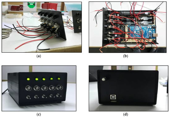 In Figure 4 some pictures describing ABDAS during its integration are included. Each measurement channel is activated by a 3-position switch located at the front panel of the system’s enclosure. These switches include a first (middle) position: channel not activated; up position: channel activated; down position: channel activated with 1.5 V offset. A simple 5-led lightning system has been also included in the design to inform about the status of each channel. A reset switch is located at the rear part of the enclosure, to restart the system. Finally, it should be said that one of the advantages of ABDAS design is that the Arduino board can be easily removed.