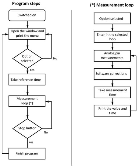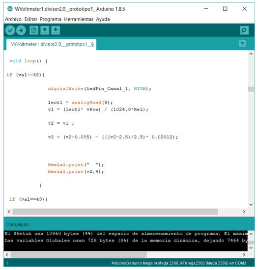 The software developed for the device must be able to be modified easily to suit future changes in the specific requirements. The code was written using the Arduino language (that is, open source software). The program flow chart is shown in Figure 5. As it can be observed, the measurement loop, which is the algorithm responsible for the data measurements in each channel, is quite short, compact and simple. The results of the voltage dividers’ calibration (Figure 3 and Table 2) are included in the code (“Software correction” in the aforementioned flow chart from Figure 5). See in Figure 6 an image capture of the code program.
