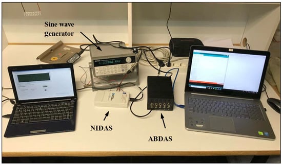 Obviously and according to the reference signal (Equation (3)), the data measured by both acquisition systems, ABDAS and NIDAS, should ideally be the same: y0 = 3; y1 = 2.5; and yi = 0 for i > 1), leaving aside the possible errors of the sine wave generator.