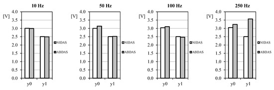 As said in Section 3, the generated sine-wave signal was measured with both NIDAS and ABDAS during 30 s for each selected frequency. Ten complete wave periods were extracted from all data records, the Fourier series being calculated for all of them. In Figure 12 the averaged values (from the 10 selected wave periods) of the first couple of terms (the offset, y0, and the first harmonic, y1) are shown. It can be said that up to 100 Hz frequency signals, measurements carried out with ABDAS are very similar to the ones obtained with NIDAS.