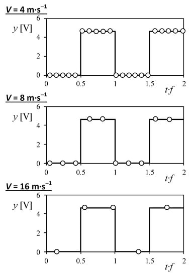 In Figure 15, the sample points obtained by ABDAS along 2 periods of one the three tested cup anemometers’ output signal (square wave), are shown for three different wind velocities, 4, 8, and 16 m·s−1. As it is logical, the number of points taken per period decreases with the wind velocities, as these higher wind velocities produce increase the frequency of the output signal. From the data measured with ABDAS from each cup anemometer at all wind velocities, the frequency of the output signal was calculated by two different methodologies used in cup anemometer calibration labs: