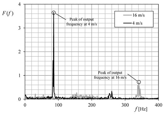 In Figure 16 the Fourier transform of the data recorded from the Anemometer-2 calibration, at 4 and 16 m·s−1 is shown. The peak of the transforms reveals the anemometer’s output frequency that, once correlated to the wind speed, defines the anemometer transfer function (see Figure 17). These calculations were carried out by using GNU Octave.