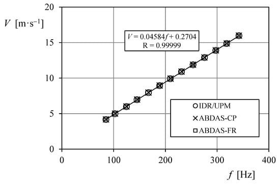 Calibration points of Anemometer-1, obtained from the IDR/UPM calibration system (the transfer function resulting from these data is included in the graph), and from the data measured with ABDAS and post-processed counting pulses (ABDAS-CP; see Equation (6)) and using the Fourier transform (ABDAS-FR; see Equation (7)).