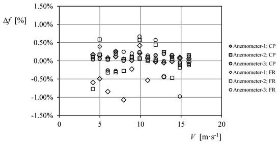 is shown for the three calibrated anemometers. The graph displayed in this figure indicates a larger deviation of the frequencies based on the Fourier transform from the ones calculated with the reference IDR/UPM calibration system. Furthermore, the standard deviation of these data, σ∆f, is included in Table 5, clearly indicating a poorer results of the calibrations performed using the Fourier transform instead of counting the number of pulses within the recording period.