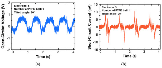 Electrical signals of a polytetrafluoroethylene (PTFE) ball from one Al electrode: (a) Open-circuit voltage; (b) Short-circuit current.