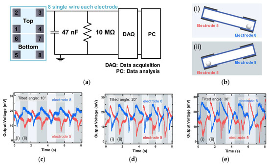 The following experiment was conducted to investigate the influence of the external force on the OT-TES. Depending on the external environment or force, PTFE balls in the OT-TES roll along the surface and make electrical output at the corresponding electrode. Two conditions were prepared, which are shown in Figure 3b. The DAQ output voltage of electrode 5 and 8 with a PTFE ball and measured by the multi-channel system are shown in Figure 3c–e. In this experiment, the tilting range was from 10 to 30 degrees and a multi-channel system was used.
