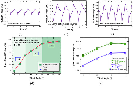 To determine the voltage changes relative to the angle, the OT-TES was tilted from 0° to 40° and 25% of the bottom area was covered by PTFE balls. Figure 4d shows the VOC of one bottom electrode. When the VOC rose to 10°, with an increase rate of 12.4 V/degree, the increase rate decreased to 6.3 V/degree with 25°. Finally, beyond 25°, the growth rate was sharply decreased to 0.83 V/degree and saturated. This means that the VOC had reached a measurable peak. The larger size of the OT-TES could measure larger ranges than this proposed device.