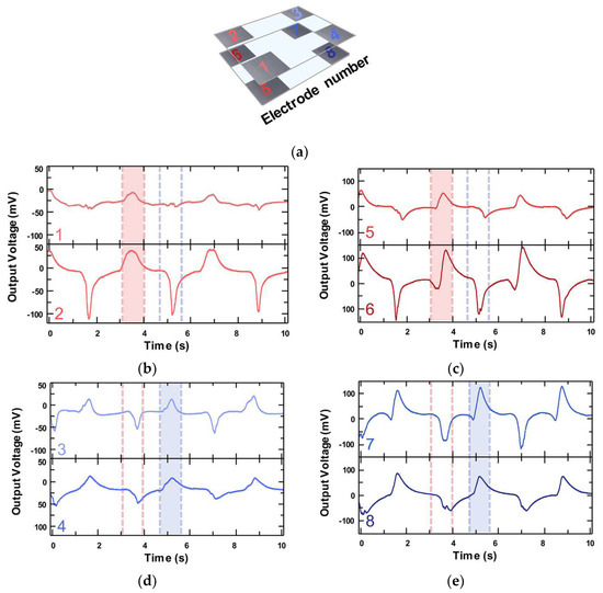 In Figure 5b–e, the channel can be divided into two groups according to the shape of the output voltage. Waveforms of channel 1, 2, 5, and 6 (red color), and 3, 4, 7, and 8 (blue color), respectively, show the similar shape of the output voltage. The output voltages of each pair were elevated simultaneously. The electrodes corresponding to the two pairs of channels were located at each end of the device. When one side goes down, naturally, the other side goes up.