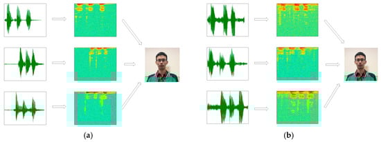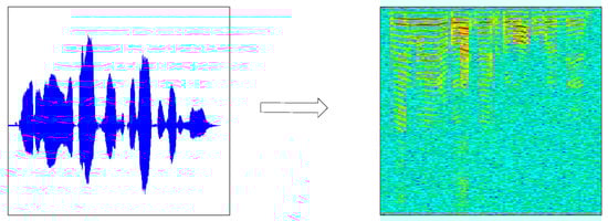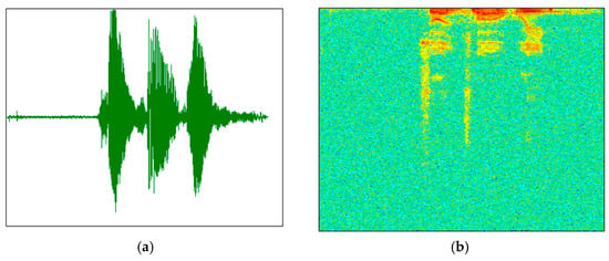 Before using audio training or testing model, due to the short-time invariability of speech signal, a speech signal x (t) was first divided into x (m, n) (n was frame length, m was the number of frames), and we got X (m, n) through the short time Fourier transform. The periodogram Y (m, n) was obtained from X (m, n) using the formula (Y (m, n) = X (m, n) × X (m, n)’) and then by taking 10 × lgY(m, n). Finally, m was transformed into the scale M according to the time, n was transformed into the scale N according to the frequency, and a two-dimensional graph (the speech spectrogram) was drawn according to (M, N, 10 × lgY(m, n). The speech spectrogram (b) was generated by the original speech signal (a), as shown in Figure 2.