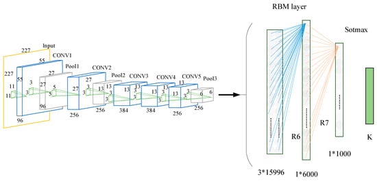 The pre-trained CNN model was migrated to a small target set, and we retrained the hybrid model of combining CNN with RBM. Then, the BP algorithm is used to fine tune the parameters of RBM and Softmax classifier. As shown in Figure 5, when the hybrid model was retrained, the fully connected layer (FC6–FC8) in the pre-trained CNN model was removed and replaced by the R6–R7 layer and the new Softmax layer. The extracted features from the RBM layer were output to Softmax Classifier. In order to combine all the features of the convolutional layer activation, the RBM layer played the role of full connection. In this paper, we concatenated the 256 6 × 6 features of CONV5 output into a feature map of 1536 × 6, and then the feature map was input into the RBM layer. The R6 of RBM model had 1536 × 6 nodes in the visible layer, 6000 nodes in the hidden layer, and 1000 hidden nodes in the R7 layer. The 1000-dimensional vector was input into the Softmax classifier layer and calculated before the voiceprint could then be found, corresponding to the maximum probability. The structure of the TLCNN-RBM hybrid model is shown in Figure 5.