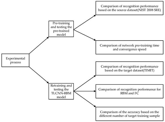 When the small sample voiceprint was used to train the CNN network, the recognition accuracy of the voiceprint was low because of the small amount of voiceprints and the differences between the voiceprint data sets. In order to improve the performance of small sample voiceprint identification, the pre-trained CNN model was transferred, in which fast batch normalization was added. Based on this, to improve the quality of features, RBM layers were used to replace the CNN network’s full connected layers. These RBM layers not only integrated all of the voiceprint feature maps under the convolutional layer, but also could learn more about the higher-level voiceprint features owned by the small samples from the feature maps. Therefore, more voiceprint features could be extracted, improving the recognition rate. The flow of the algorithm is shown in Figure 1.