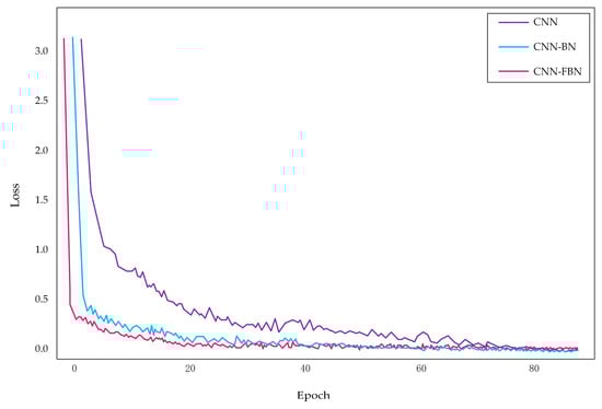 The experimental results show that the loss of the network with FBN is significantly smaller than that of the network with BN or without FBN when the three networks are trained, respectively. According to the loss of the network during the training process, it shows whether the network is converged. As the network training advances, all of three models gradually converged, but surprisingly, we could clearly see that the CNN network with FBN converged faster. Furthermore, as the iterative process proceeded, we can see that at the beginning of training, the loss value decreased rapidly, then the rate of decrease slowed down. Apparently, the loss value of the network showed a tendency toward stabilization, and the fluctuation was small. The experimental results proved that FBN added into convolutional layers could effectively accelerate the convergence of the network.