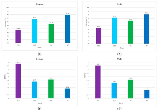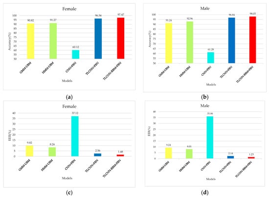 Comparison of the performance for five models. (a) Comparison of accuracy for five models based on female, (b) comparison of accuracy for five models based on male, (c) comparison of EER for five models based on female, and (d) comparison of EER for five models based on male.