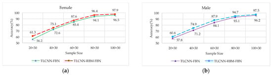 The accuracy for voiceprint recognition under different retraining sample sizes. (a) Comparison of accuracy based on female, (b) comparison of accuracy based on male.