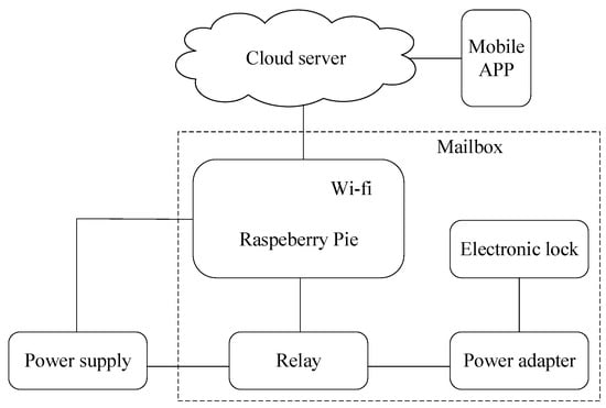 The intelligent mailbox mainly consists of 1-raspberry pie, 2-electronic lock, 3-power adapter, and 4-relay. The physical diagram of the mailbox is shown in Figure 18, and the schematic diagram of the mailbox is shown in Figure 19.