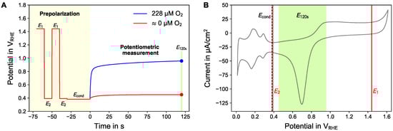 (A) One cycle of the active potentiometry comprising a prepolarization phase (marked, left region) and the potentiometric measurement phase (unmarked, right region). The results shown in this figure were obtained with VRHE resulting in good oxygen sensitivity during the potentiometric phase. The potentiometric phase lasts for 120 s in which the measurement value is taken at its end () providing one data point per repetition. The blue curve was obtained in air-saturated and the red curve in nitrogen-flushed PBS. (B) Overlay of the potentials from A over a cyclic voltammogram of platinum in air-saturated PBS to illustrate the different potential regions.
