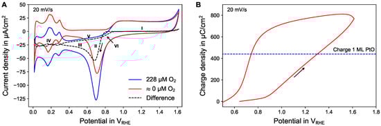 These results confirm the interpretation of the data shown in Figure 2A. The difference signal in the CV goes back to zero (region VI) around the same potential of VRHE which can be observed in case of air-saturation for . We speculate that for longer waiting time or higher oxygen concentration this potential would approach . This steady-state value can be associated with nearly full coverage of the electrode by a monolayer of PtO. Comparing the value of with Figure 2B, a higher value associated with 1 ML of PtO of VRHE was found. We speculate that all three values refer to the same electrode status and should approach the value of for infinite waiting time during the potentiometric phase or infinitely slow scanrate.