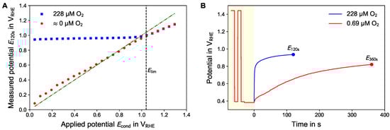 Figure 3A shows the OCP after 120 s () for different conditioning potentials . In case of air-saturated electrolyte the values are nearly constant around VRHE for any conditioning with VRHE. The OCP values of the nitrogen flushed electrolyte were nearly the same as for any conditioning with . For any prepolarization with the resulting OCP values are independent of the oxygen concentration. In this case, the OCP values were slightly decreasing during the potentiometric phase resulting in .