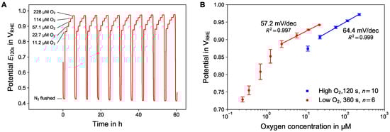 (A) Trace of active potentiometry measurements of 10 consecutive concentration ramps with higher oxygen concentrations. (B) Calibration curves for the concentrations ramp with higher and lower oxygen concentration range. In case of lower oxygen concentrations (red disks) the OCP phase was prolonged to 360 s.