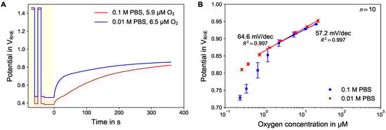 Figure 5B displays the calibration curves as mean value and standard deviation of the values for both electrolyte concentrations. The calibration curve in 0.01 M PBS follows logarithmic behavior with a slope of 64.6 mV/decade dissolved oxygen concentration. In contrast, the calibration curve in 0.1 M PBS shows logarithmic behavior for higher concentration only, with a slope of 57.2 mV/decade, while for lower oxygen concentration the measured potential deviates towards lower numbers similar to the results shown in Figure 4B.