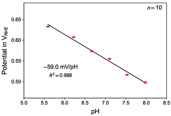 Figure 6 shows the values of the platinum electrode depending on the pH of the electrolyte in air-saturated electrolyte. The slope of the mean values from 10 measurements was found to be mV/pH in case the results are expressed as potential with respect to normal hydrogen electrode (NHE). Correcting the obtained data by applying the concept of RHE, the data would show no change with pH.