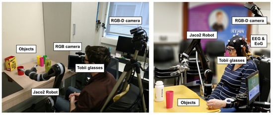 All participants were sitting in an electric wheelchair in front of a desk. Moreover, a Jaco2 robot is attached to the wheelchair (see Figure 1). In addition, the multimodal interface is composed of: (1) a pair of gaze-tracking glasses and a hybrid brain–computer interface (BCI) based on electroencephalography (EEG) and electrooculography (EOG); (2) context recognition sensors: two cameras to locate the object’s position and the user’s mouth position; (3) sensors for the monitoring of physiological parameters (breathing rate, heart rate, heart rate variability, galvanic skin response); and (4) a central server (YARP) for the communication. YARP stands for Yet Another Robot Platform. The experiments and results presented in this paper focused on the algorithms used for gaze-tracking and context recognition.