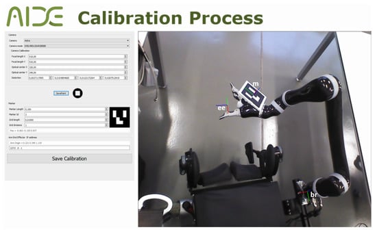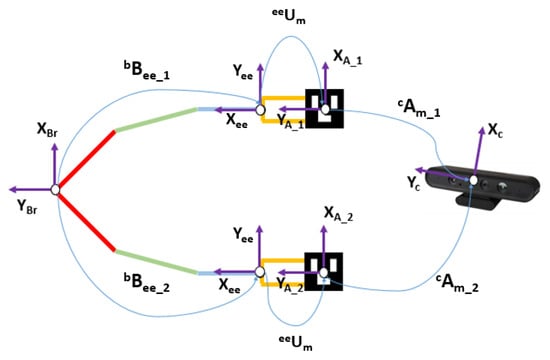 The objective of the calibration between the RGB-D camera and the robot is to make it possible to transform the coordinates system from the camera to the coordination system of the robot. This problem in robotics is known as hand–eye calibration. Specifically, it consists of estimating the homogeneous rigid transformation between the robot hand, or end-effector, to the camera as well as to the world coordinate system (see Figure 2). In the developed platform, the world coordinate system coincides with the robot base and the camera is not in the final effector of the robot but in a fixed position outside the robot. Let the rigid transformation of the robot-base to the end-effector be , and be the transformation of the camera to an augmented reality mark system. This system is an Aruco [] mark mounted on a known pose on the robot thanks to a printed piece as can be seen in Figure 3. The transformation between the mark and the robot end-effector is calculated using the CAD schematics of the robot and the printed piece. Thanks to this, the position and orientation of the end-effector can be expressed regarding the robot base and the camera system as shown in Equation (1). From this equation (Direct Calibration), the direct transformation can be easily extracted.