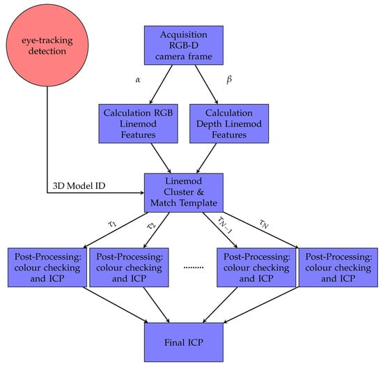 The method developed for the detection and pose estimation was derived from the detection method of Stefan et al. [], known as LINEMOD. The eye-tracking stage gives the ID of the object to track, so the Hinterstoisser et al. algorithm [] only has to search one class of model. Consequently, it is more efficient, has a lower rate of false positives, and removes the scalability problem of different classes of objects that the Hinterstoisser et al. algorithm experiences.