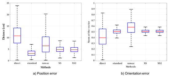 Position and orientation errors using different calibration methods: (a) Position error measured as a distance from the correct position; (b) Norm of the orientation error vector computed by Rodrigues’ expression.