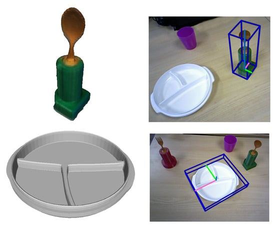 Figure 8 depicts two objects employed in the AIDE project and its pose estimation. Please note that the spoon CAD model was obtained by scanning the actual object using a KinectFusion algorithm [] and a RGB-D camera, while the plate CAD model was modelled using Autocad 3ds Max. This example sustains the affirmation that our algorithm works with models with poor and high quality.