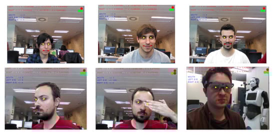 The mouth pose algorithm was tested with different users during experimental sessions as can be seen in Figure 9. In this figure, pupil landmarks are coloured yellow while mouth landmarks are red. 3D coordinates are written on the top of the images, and on the top-left corner there are three circle indicators. These indicators change colour to green when the user has their mouth open or if the user is blinking their eyes. These events are also communicated as numerical values and written in blue text on the image. As can be seen, the algorithm worked well with/without facial hair, with glasses, and with different genders.