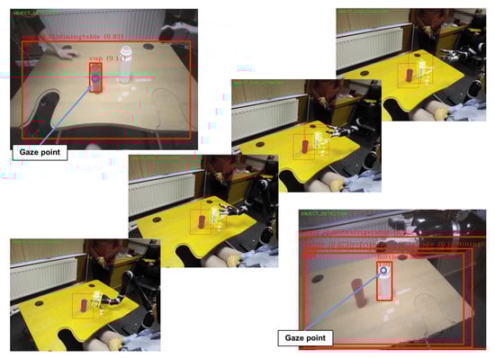 Images of the context recognition and eye-tracking systems in experimental tests. Examples of object detection (cup and bottle) with the estimated gaze position (blue circle). Snapshots of the experiments: grasping a bottle using the Jaco2 robot.