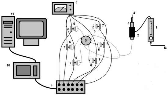 Experimental setup used for the measurements with the electronic nose comprising six bulk acoustic wave sensors. 1: flowmeter, 2: oven, 3: injection port, 4: solid-phase microextraction (SPME) fibre holder, 5: distribution valve, 6: crystal cells, 7: oscillators, 8: power supply, 9: BNC box, 10: Counter/Timer device NI PXI 1033, 11: Computer.
