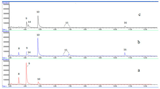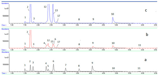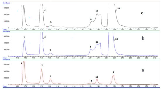 GC–MS chromatograms for cheese prepared from pasteurized milk, along ripening: (a) at zero days, (b) after 7 days, (c) after 21 days.