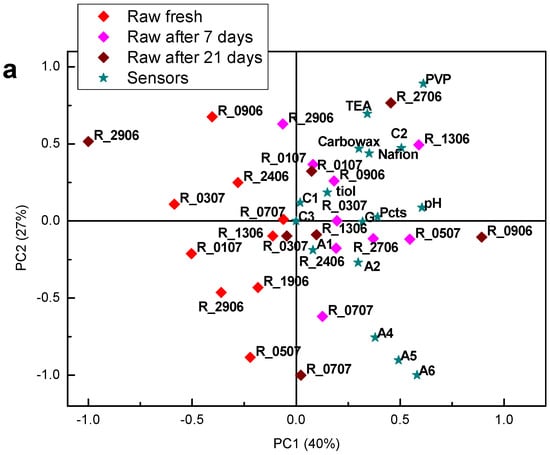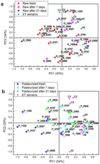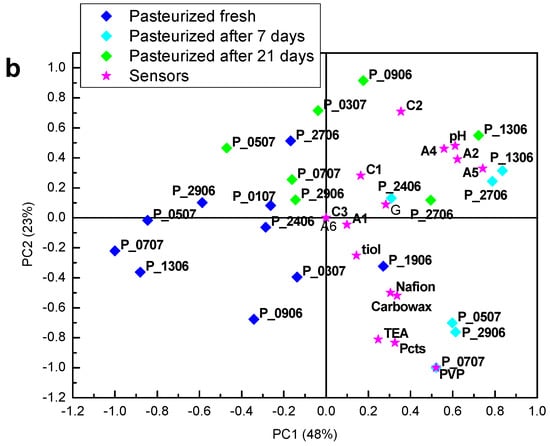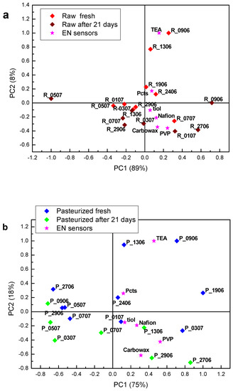 Figure 6 shows PCA biplot of cheese data, prepared from raw (Figure 6a) and pasteurized milk (Figure 6b), fresh and three weeks matured, respectively, showing the loading of each variable and the score of each cheese sample, obtained analysing the samples by the electronic nose (EN sensors).