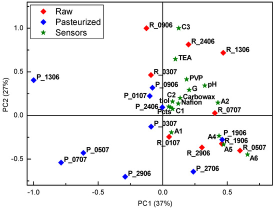 PCA score and loading bi-plot of the fresh cheese samples prepared from raw and pasteurized milk. PCA model was calculated using fused electronic nose and electronic tongue data.