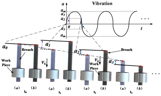 Figure 1 schematically illustrates the principle of the VAB process. As shown in the figure, a simple harmonic motion (SHM) is generated in the broaching direction. Thus, compared to CB, VAB is an intermittent cutting process because of linear reciprocating motion during broaching.