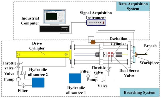 Figure 2 illustrates the schematic of the experimental setup. The whole experimental system can be broadly divided into two parts: broaching system and data acquisition system. Figure 3 shows the broaching system setup. Compared with a CB machine, a novel hydraulic exciter is installed on the broach machine, which generates the SHM on broach during cutting process. As shown in Figure 1, the exciter has changed the traditional broaching process, which converts hydraulic energy into mechanical energy used to drive the broach in cycle. The specific settings of the system are as follows: the back end of exciter is fixed on the slide body (coaxial with the broaching cylinder). And the broach chuck is fixed on the top end of exciter. The cylinder body is integrated with the valve seat. Otherwise, in order to on-line measurement of broaching force, the workpiece is fixed on four piezoelectric sensors, which are distributed around the guide sleeve and installed on the bed of broaching machine as shown in Figure 3.