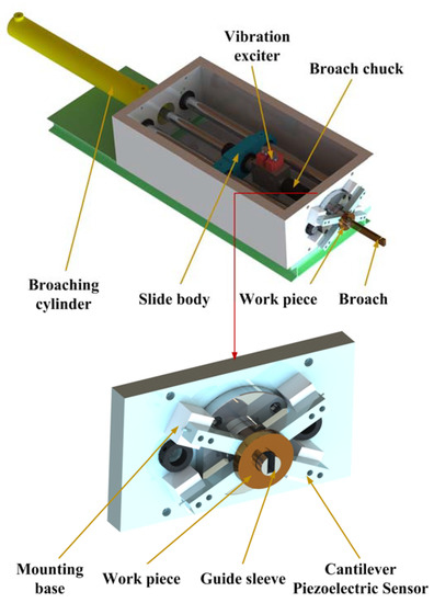 Studies have shown that the measuring method of broaching force can measure the cutting force from the local deformation of a machined component through a strain gauge [38]. However, this method requires that the mechanical structure to which the strain gauge is attached be able to generate local deformation, which has limitations. It is also possible to use an oil pressure sensor to measure the broaching force in the broaching process [39], but the oil pressure sensor does not have a significant effect on the measurement of the broaching force under vibration. It is also possible to estimate the cutting force by establishing a cutting force model [40,41]. For the dynamic broaching force in the HVAB proposed in this paper, a piezoelectric sensor with good dynamic response and high sensitivity was used to measure broaching force [42,43,44,45,46].