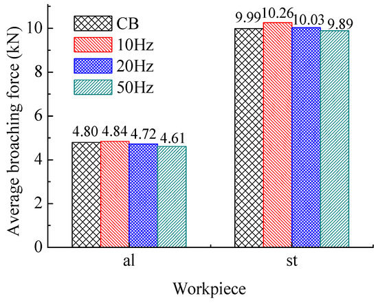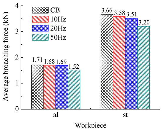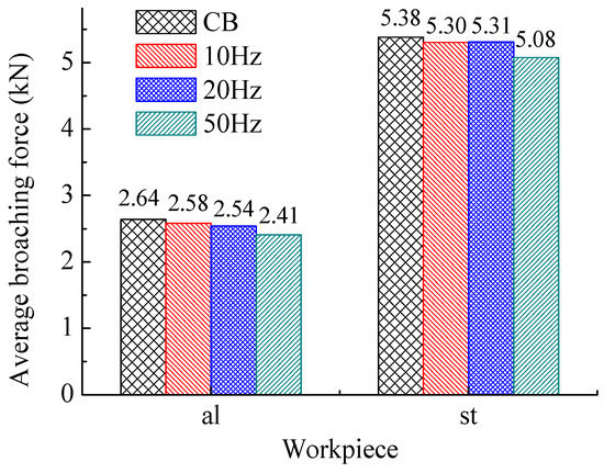 It can find that the broaching forces decrease with frequency increasing in general. The reason is that higher frequencies of vibration results in a smaller single of the amount volume of work piece in one time according to Equation (4). Thus, another explanation could be that the average effective cutting speed (corresponding only to the positive part of the translational speed; around 225 mm/s at 50 Hz for example) increases with the frequency increase; and the HVAB cutting force generally decreases with the cutting speed increase. Besides, the CB force can be expressed by [50]:
