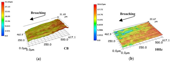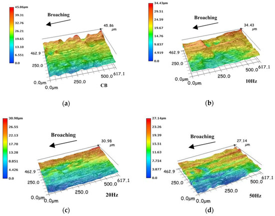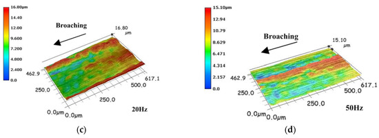 Figure 9 and Figure 10 show the measured results of the machined surface by the high speed microscope with the frequency of vibration varied as 0 Hz (CB), 10 Hz, 20 Hz, and 50 Hz. Without vibration in Figure 9a and Figure 10a, some scratches and irregularities appear on the machined surface.