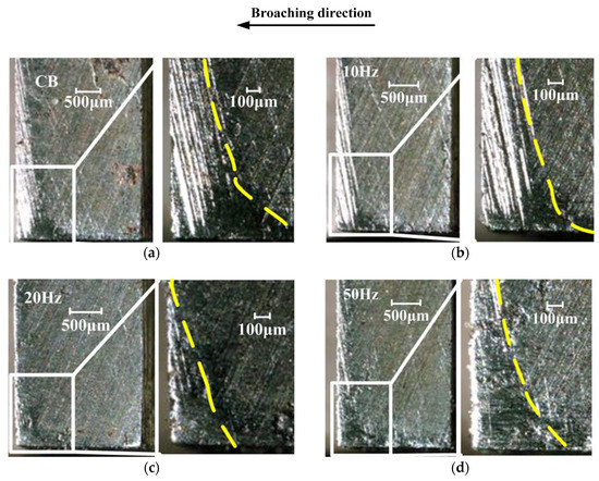 From the Figure 11, the maximum wear widths VBmax are 307.7 μm (CB), 235.8 μm (10 Hz), 132.1 μm (20 Hz) and 176.5 μm (50 Hz). It can be found that the area of wear at the flank face is significantly decreased, compared to CB. The reason is that the higher frequency induces comparatively shorter cutting time, which can lower broaching temperature on the cutting edge during broaching. But, compared Figure 11c,d, it shows that the wear width is bigger with frequency increase. The reason lies in that the higher vibration frequency induces comparatively longer tool-workpiece contact ratio, therefore the portion of each cycle where the broach is in contact with the workpiece is larger.
