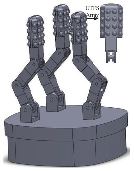The detail of the dexterous hand structure is shown in Figure 2, according to the human fingertip structure and the principle of sensory sensation of human skin. The dexterous hand is designed with three fingers, and each finger contains three degree of freedom (DOF) because dexterous hand mainly depends on the function of pinching and grasping to realize underwater sample collection. Each finger is driven by a servo motor which is mounted in the palm of the hand and connected to the finger joints, and the fingers grasping and releasing motion of the manipulator is achieved through the forward and reverse direction rotation of the servo motor. A low density UTFS array is mounted on the front and side views of the Distal Interphalangeal Point (DIP) joint of each finger for the dexterous hand intelligent grasping. The UTFS array consists of two kinds of force sensors, and one of which composed of eight force sensors can measure the force information of the fingertip inner surface. The other kind of UTFS can obtain the information of grasping force on the side, and the left and right side are composed of four force sensors respectively. The force measurement principle is that the upper hemispherical flexible contact as cover transfers the external water pressure and tactile force information to silicon cup elastomer through silicon oil, at the same time, the low hemispherical flexible contact also as cover transfers the external water pressure to the other side of the silicon cup elastomer through silicon oil to balance the water pressure, which makes the silicon cup elastomer directly measure the external tactile force signal by water pressure vector superposition. The screw holes are machined in the bottom of the dexterous hand to connect with the robot arm.