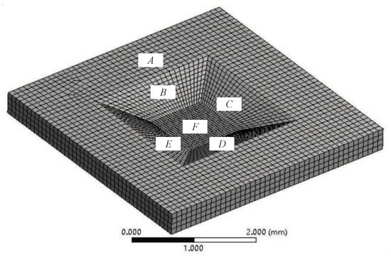 The material properties are added to the model of the silicon cup geometry. The elastic modulus is set as 190 GPa and the Poisson ratio is 0.28. Employing Solid186 hexahedral element mesh method and the model is divided into 154,530 nodes and 33,786 units. The model mesh, the constraint and load applied are shown in Figure 6. It is applied fixed constraints in the region of A, B, C, D, E and 1 MPa uniform load is applied at the bottom of the cup in the F region.