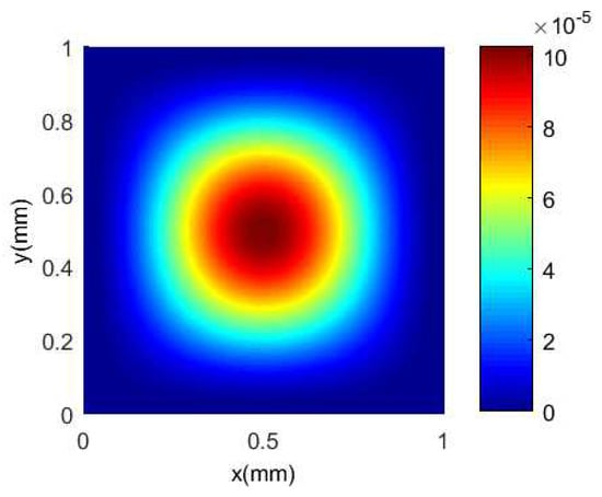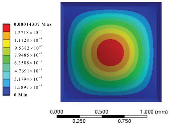 According to the comparison between Figure 7 and Figure 9, the finite element deformation nephogram of the silicon cup bottom is consistent with that of the analytical solution of Matlab software, and the deflection increases gradually from the surrounding to the center, and the deflection is the largest at the center of the silicon cup bottom [43]. The maximum deflection error of the two methods is within 18%.